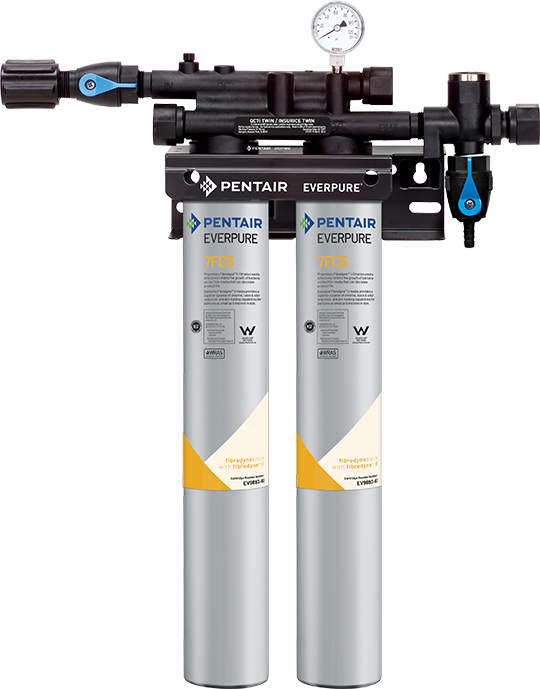 The Pentair Everpure EV920232 QC7I Twin 7FC5 delivers consistent, high-quality water for fountain beverage applications. Featuring Fibredyne™ II bacteriostatic media, this system effectively reduces chlorine taste and odors while filtering sediment down to 5 microns, ensuring exceptional beverage quality and optimal equipment performance.