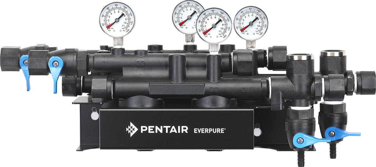 The Pentair Everpure EV927891 QC7I DIO Manifold is a specialized dual inlet and dual outlet system that combines two QC7I manifolds into a single configuration. This innovative design provides two distinct water qualities for multiple commercial applications, such as filtration for fountain beverages and filtration with scale inhibitors for ice or coffee applications, all while reducing chlorine taste, odor, and particulates.