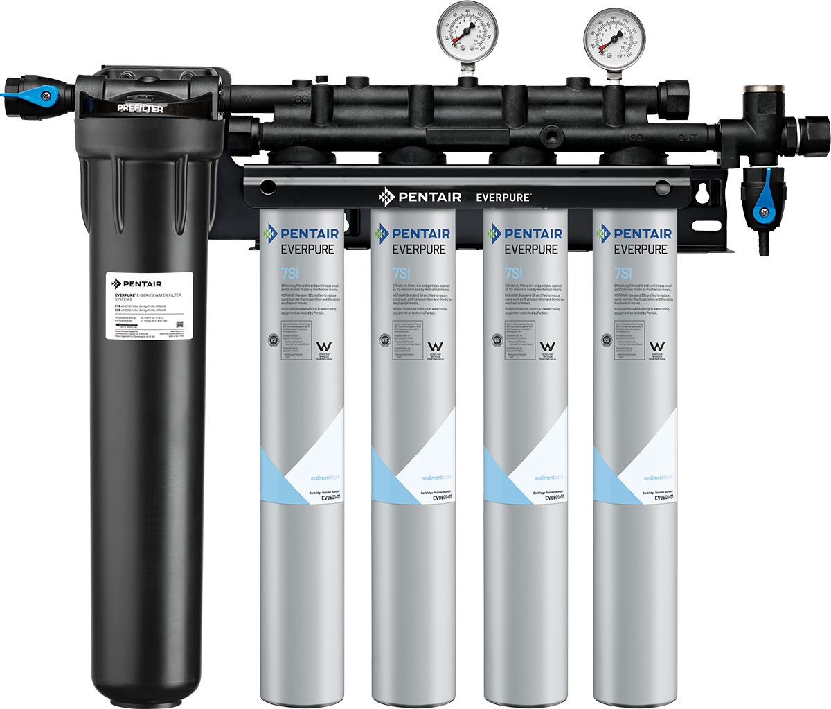 The Pentair Everpure EV932477 Insurice Quad PF-7SI is a high-capacity commercial ice filtration system designed to deliver cleaner, fresher ice while reducing bacterial growth, slime, and scale formation. Featuring Fibredyne media technology, this system micro-filters sediment down to 0.5 microns, removes health contaminants like asbestos fibers and cysts, while maintaining chlorine to inhibit slime growth in ice machines.