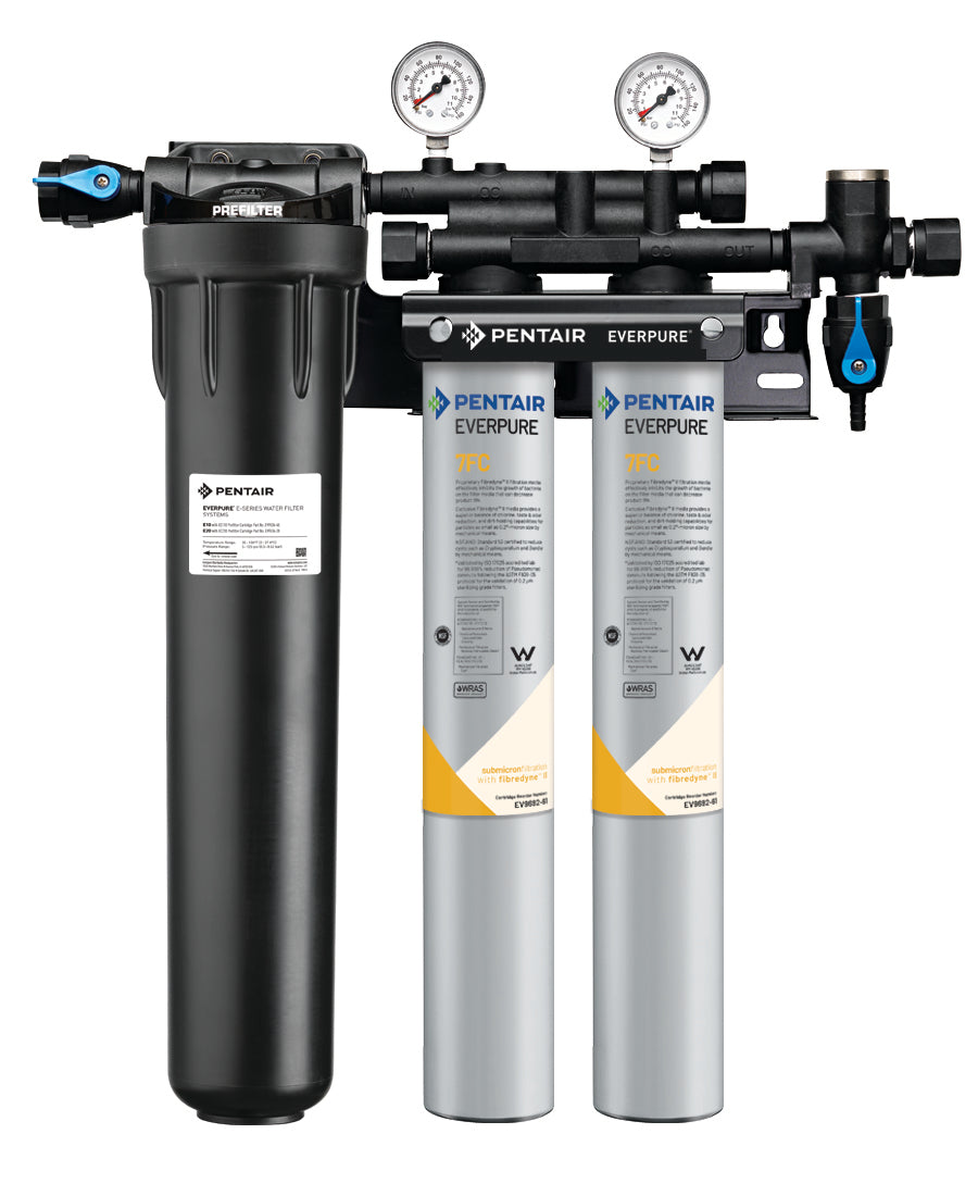 The Pentair Everpure EV932852 QC7I PF Twin 7FC is a high-performance commercial filtration system designed for fountain and cold beverage applications. Featuring Fibredyne bacteriostatic media with an integrated scale inhibitor, this system effectively reduces chlorine taste, odors, and particulates as small as 0.2 microns to deliver consistently high-quality beverages while protecting equipment.