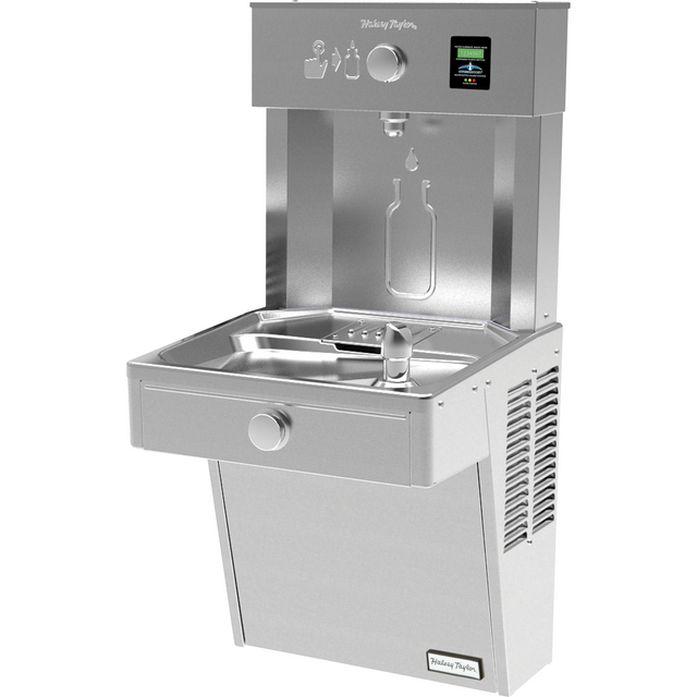 The HTHBHVR is a wall-mounted, non-refrigerated unit that includes a bottle filler and a drinking fountain. This model has a Stainless Steel color finish.