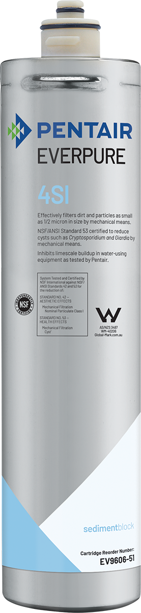 The Pentair Everpure EV960651 4SI filter cartridge provides clean, fresher ice by effectively reducing slime and scale buildup in ice machines. With exclusive precoat filtration technology, it filters particulates as small as 0.5 microns while helping to maximize equipment performance and extend service life.
