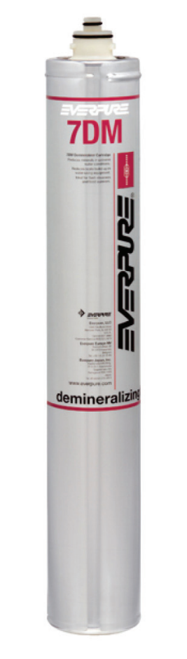 A: The Everpure 7DM is specifically designed to remove total dissolved solids (TDS) using a mix of cation and anion resin, making it ideal for equipment sensitive to mineral content like coffee machines and steamers. Unlike standard carbon filters, it actually demineralizes the water to prevent scale formation.