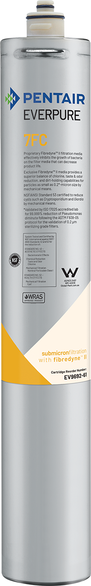 The Pentair Everpure EV969267 7FC filter cartridge provides superior filtration for commercial applications, reducing chlorine taste and odor, cysts like Cryptosporidium and Giardia, and particulates down to 0.2 microns. Designed for fountain beverages, ice machines, and coffee systems, this high-capacity filter features proprietary Fibredyne II media with antimicrobial protection for exceptional performance and extended filter life.