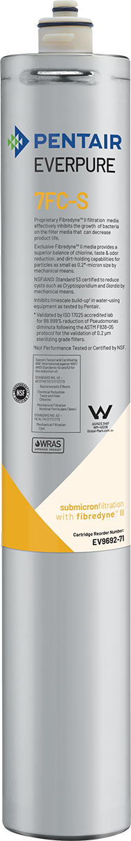 The Pentair Everpure EV969276 7FC-S filter cartridge delivers superior filtration for commercial applications. Featuring proprietary Fibredyne II media, this high-capacity filter reduces chlorine taste and odor, chloramines, and cysts while filtering particulates as small as 0.2 microns. The 7FC-S is ideal for steam equipment, combi-ovens, coffee, and ice applications, ensuring optimal equipment performance and enhanced beverage quality.