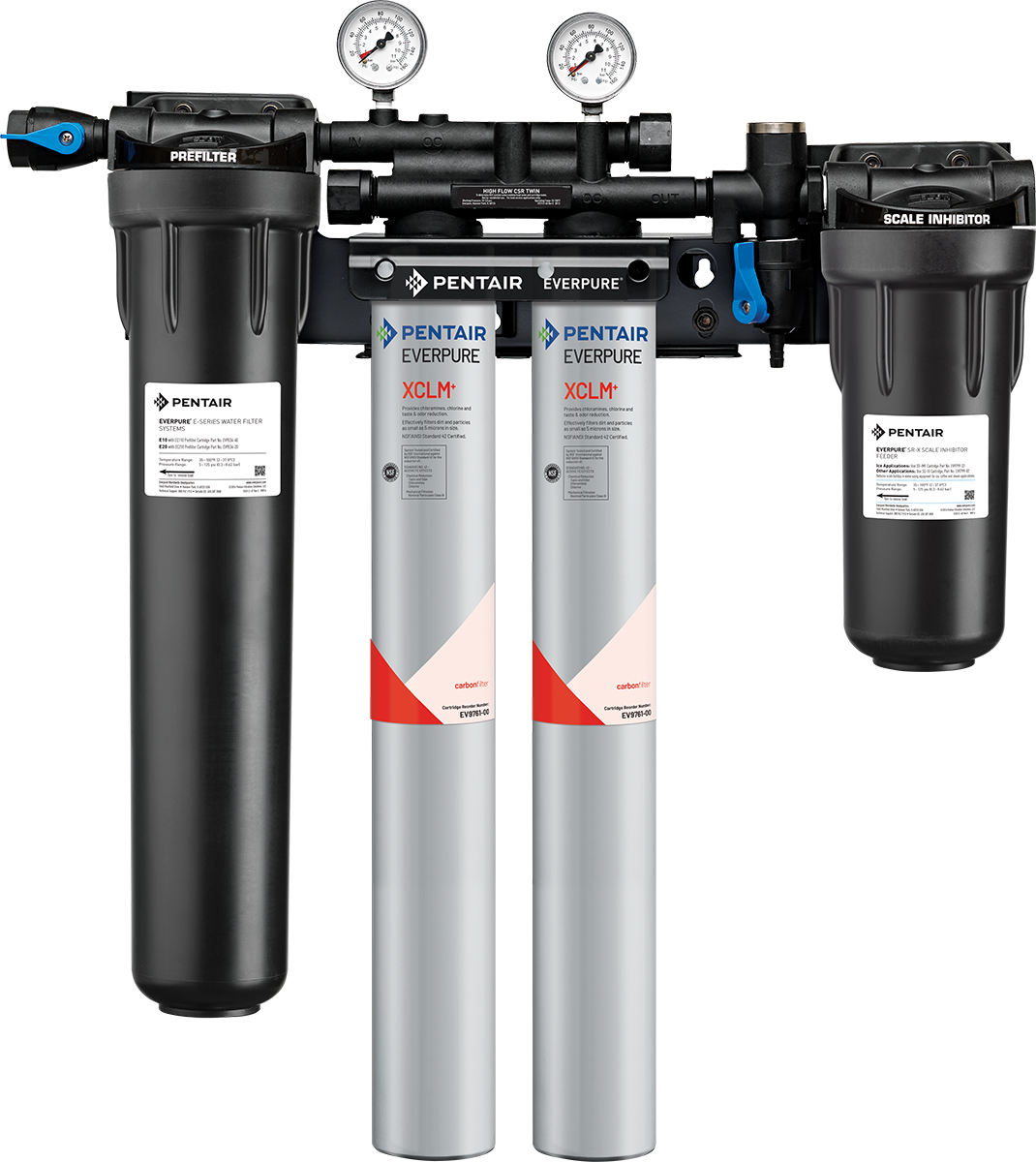 The Pentair Everpure EV976132 High Flow CSR-Twin-XCLM+ Fountain Filtration System is a high-capacity commercial water filtration solution that effectively reduces chloramines and chlorine taste & odor while filtering particulates down to 5 microns. This twin-filter system is ideal for fountains, ice machines, and coffee/tea brewers in high-demand commercial environments.