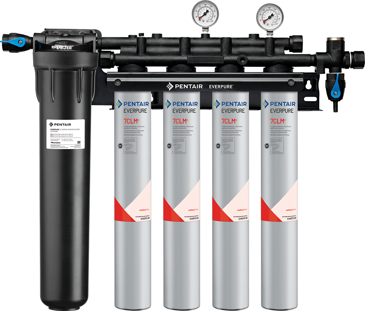The Pentair Everpure EV977124 Coldrink 4-7CLM+ is a high-capacity chloramines reduction system specifically designed for fountain beverage applications with four carbonators. Featuring specialized carbon block media, this system effectively reduces chloramines and chlorine while filtering particles down to 5 microns, ensuring consistent beverage quality and improved taste.
