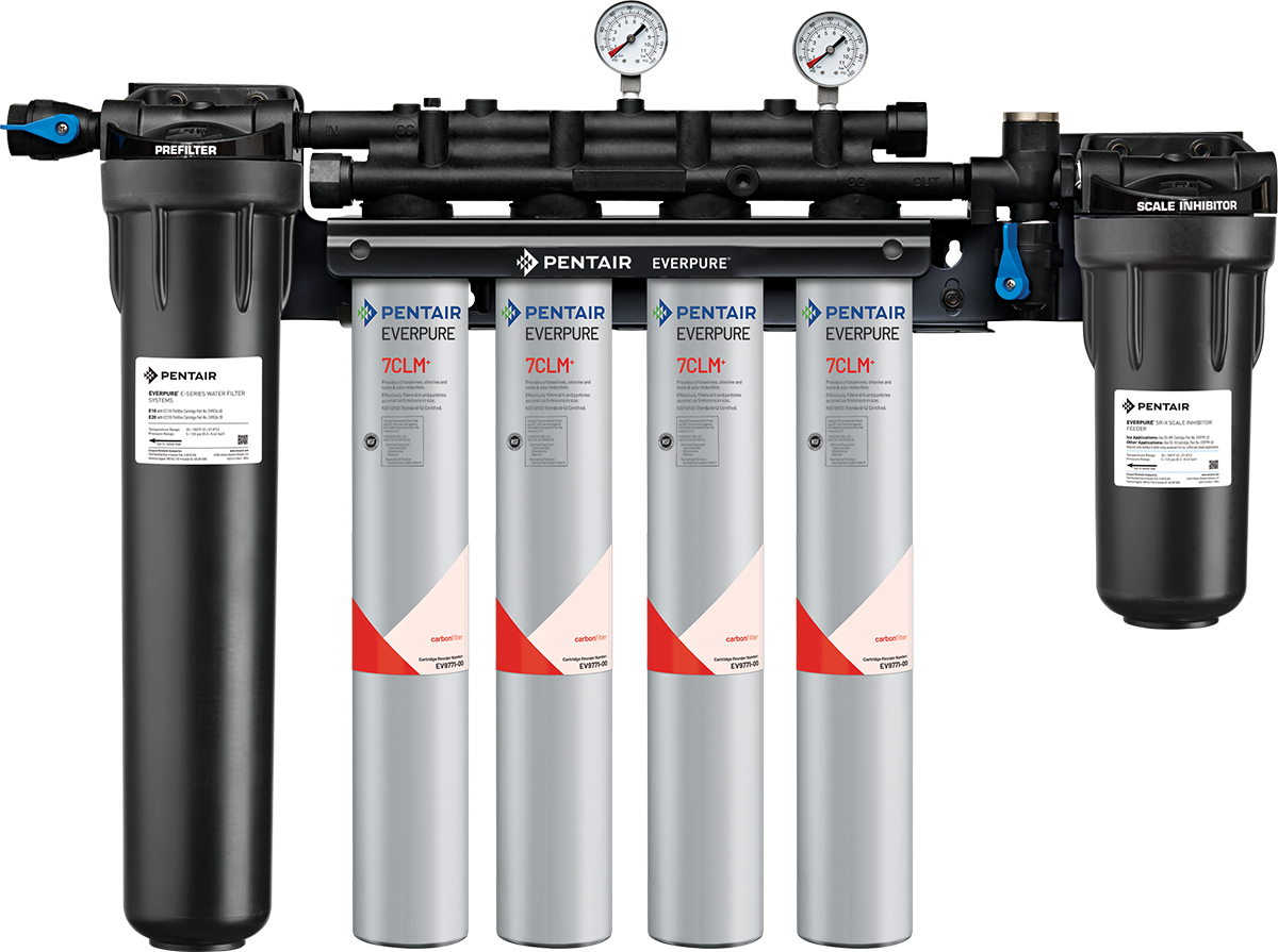 The Pentair Everpure EV977134 High Flow CSR Quad-7CLM+ System delivers premium water filtration for commercial fountain dispensers, ice machines, and coffee brewers. This high-capacity system effectively reduces chloramines and chlorine taste & odor while filtering particulates down to 5 microns, ensuring great-tasting beverages and premium ice production.